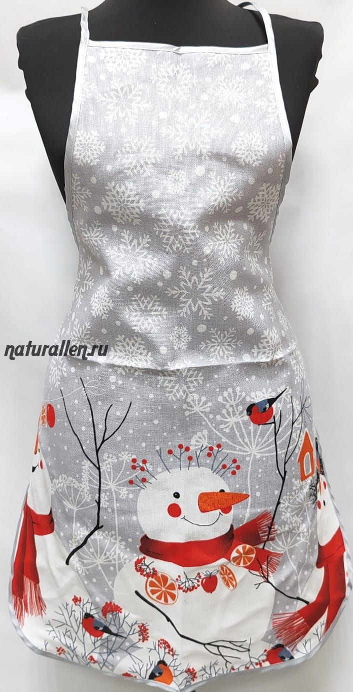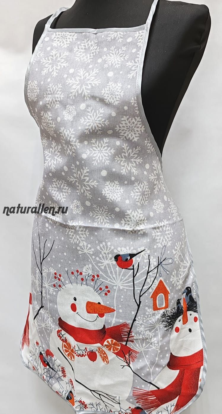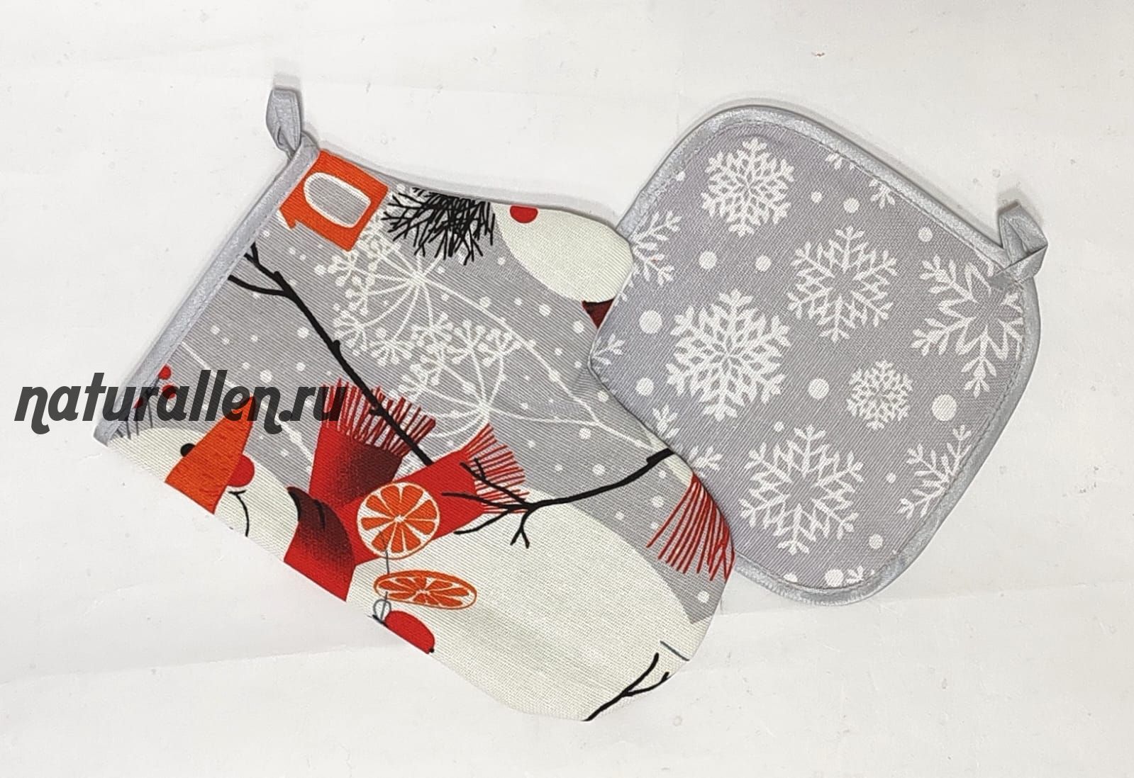 Комплект для кухни фартук с прихватками "Снеговики".Ткань рогожка, 100 % хлопок. Размеры фартука: бёдра 50 см,  длина 74 см. Размер прихваток: рукавица 23*14 см, квадратная прихватка 16*16 см.