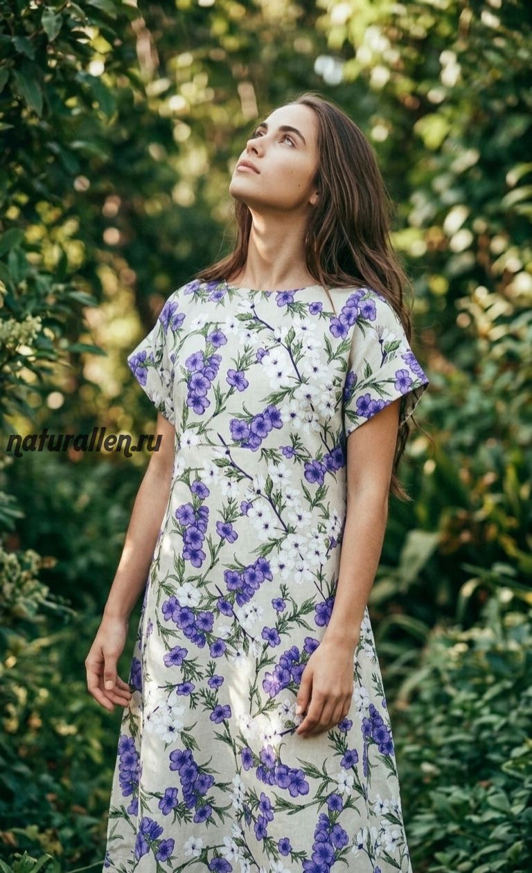 Льняное платье "Цветы Дикой Вишни". Крой свободный, с ассиметричным подолом,без карманов.Рукав короткий, на манжете. Без молний и застежек, легко и быстро одевается! Ростовка 165-175 см. Состав лён 70%/хлопок 30%. Длина ниже колена. Прекрасно подойдёт для жаркой погоды.