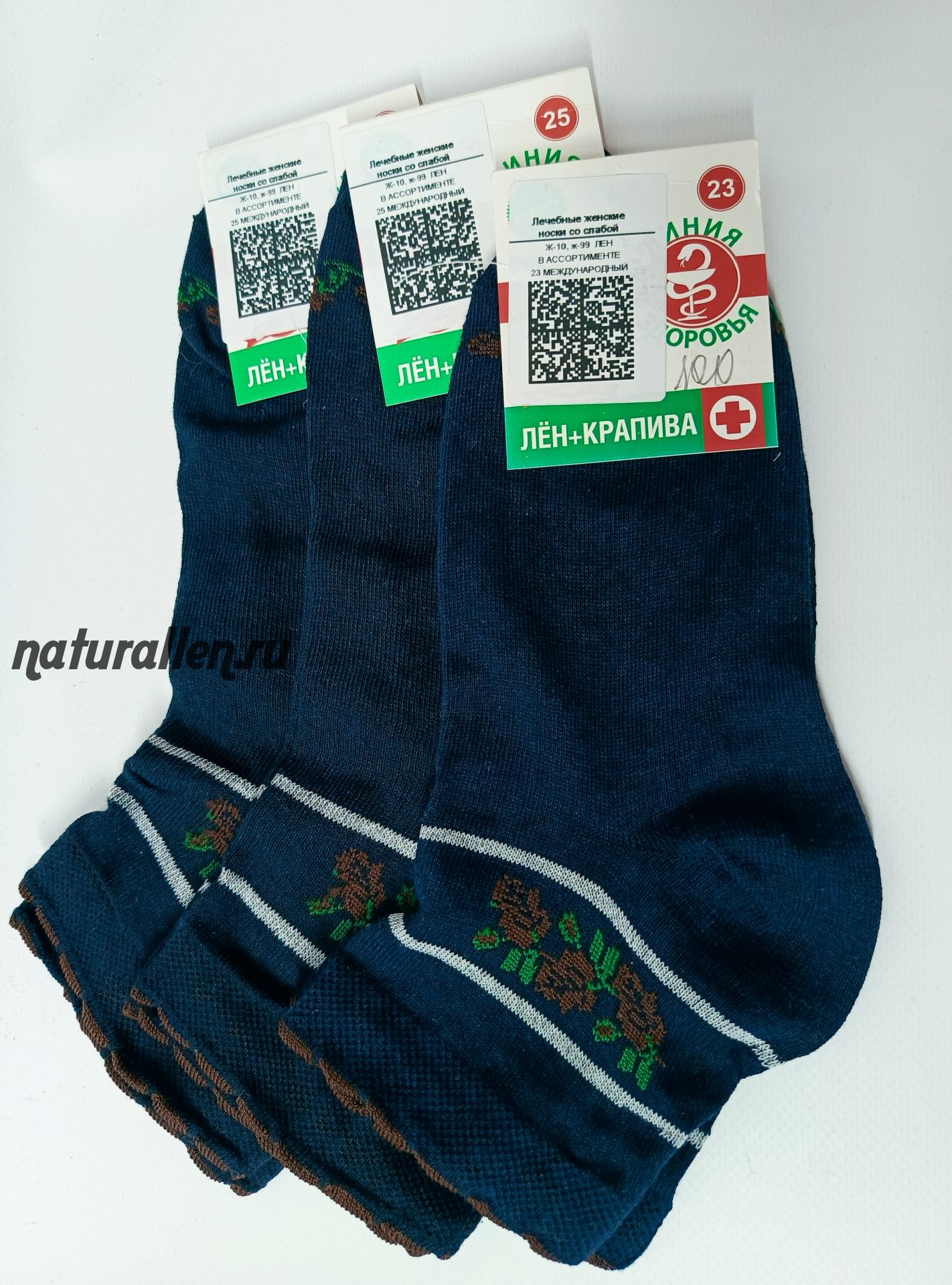 Носки женские  "Линия здоровья лен+крапива" (ослабленная резинка). Состав: лен-23%,крапива 45%,хб 29%, полиамид 3%. Медицинская (ослабленная) ажурная резинка не давит на ногу, прочные пятка,мысок и след.