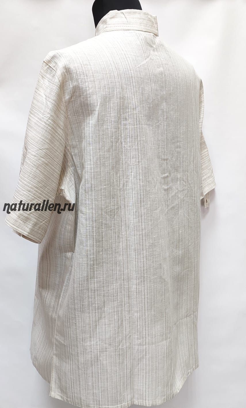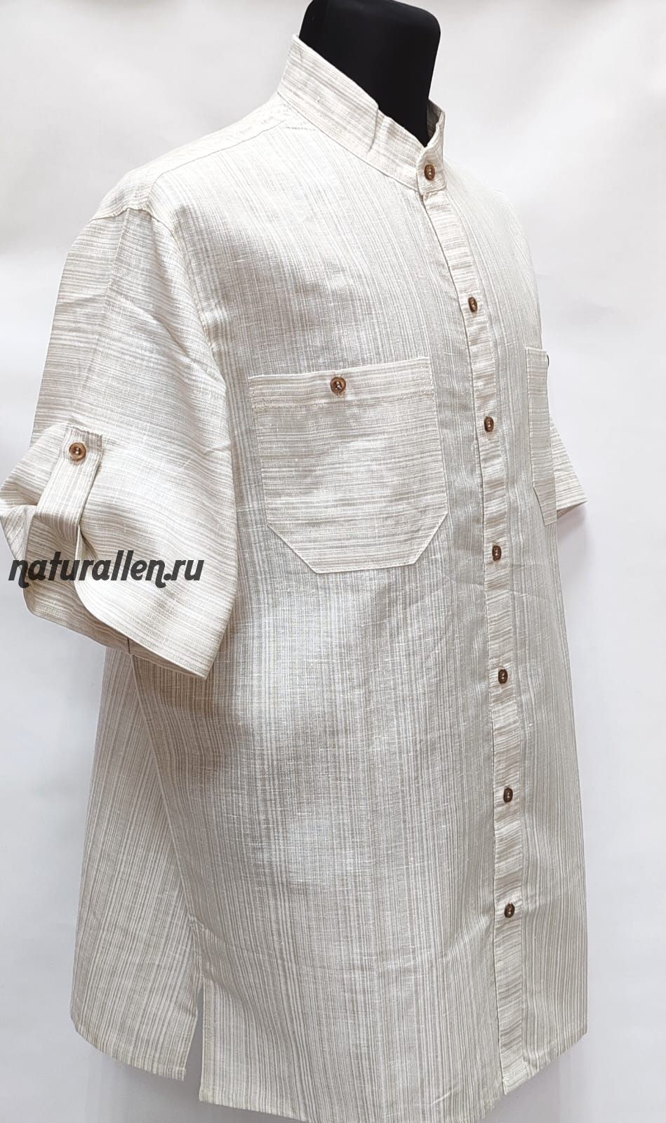 Сорочка мужская 100 % лён. Ворот-стойка, короткий рукав, петли во всю длину (распашная),два нагрудных кармана, расцветка светлая частая полоска.