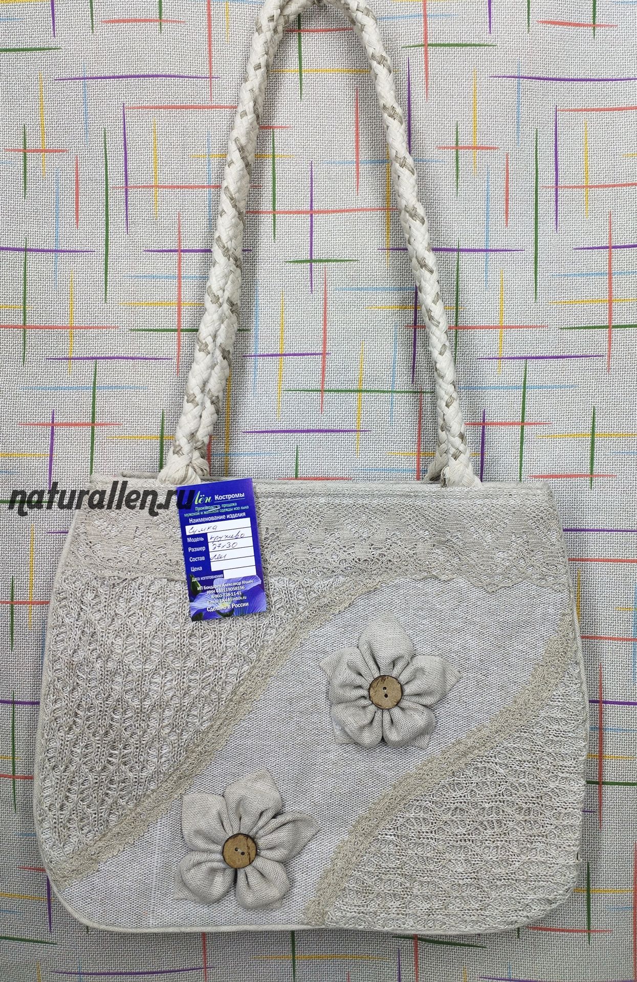 Сумка льняная летняя "Цветы". Ручная работа, украшена льняным кружевом. Материал верха: лен 100%. Материал подкладки: лен 100%. Внутри один большой отдел, карман. Снаружи отдел на молнии. Застежка - молния. Высота ручек 40 см. Длина сумки 40 см,высота 30 см,ширина 10 см.